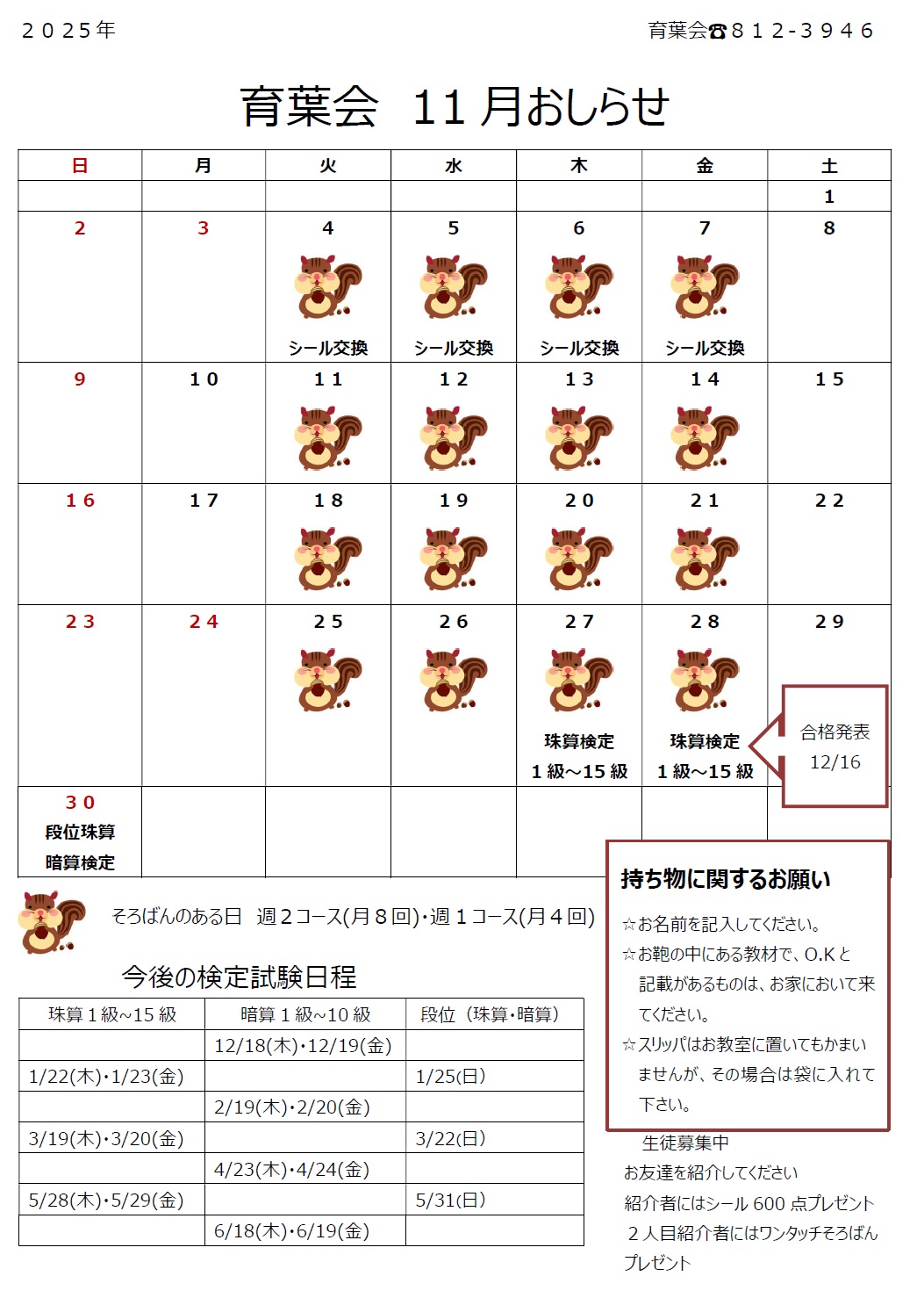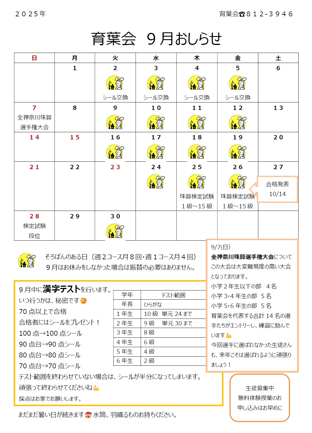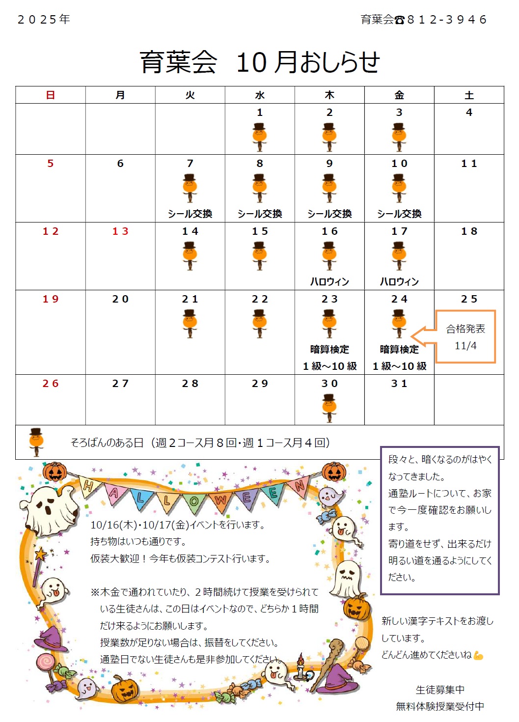 イベント 1月 お楽しみくじ(先生からのお年玉) 検定試験 珠算(15級~段位) 暗算(段位) 2月 検定試験 暗算(10級~1級) 漢字テスト 3月 春の新入生募集強化キャンペーン 検定試験 珠算(15級~段位) 暗算(段位) 4月 さんすう・さんすう応用強化月間 検定試験 暗算(10級~1級) 5月 検定試験 珠算(15級~段位) 暗算(段位) 6月 検定試験 暗算(10級~1級) 通信暗算競技大会 7月 検定試験 珠算(15級~段位) 暗算(段位) 8月 さんすう・さんすう応用強化月間 検定試験 暗算(10級~1級) ヨーヨー作り 9月 検定試験 珠算(15級~段位) 暗算(段位) 漢字テスト 全神奈川珠算選手権大会 10月 検定試験 暗算(10級~1級) さんすう・さんすう応用強化月間 ハロウィン 11月 検定試験 珠算(15級~段位) 暗算(段位) 12月 検定試験 暗算(10級~1級) 通信珠算競技大会 クリスマス会 毎月、お休みをしなっかった生徒には、シールをプレゼント!シールを集めて、色々な商品と交換ができます。 感染状況や、学校の状況に合わせて、変更する可能性があります。