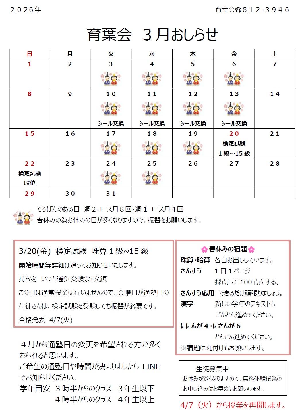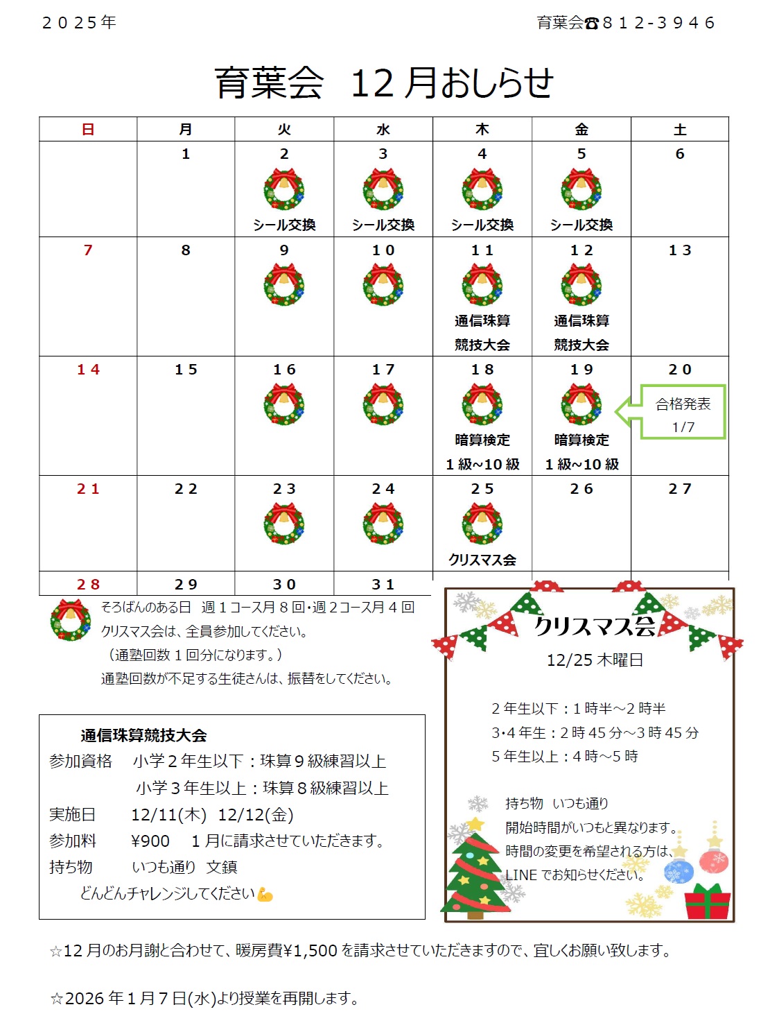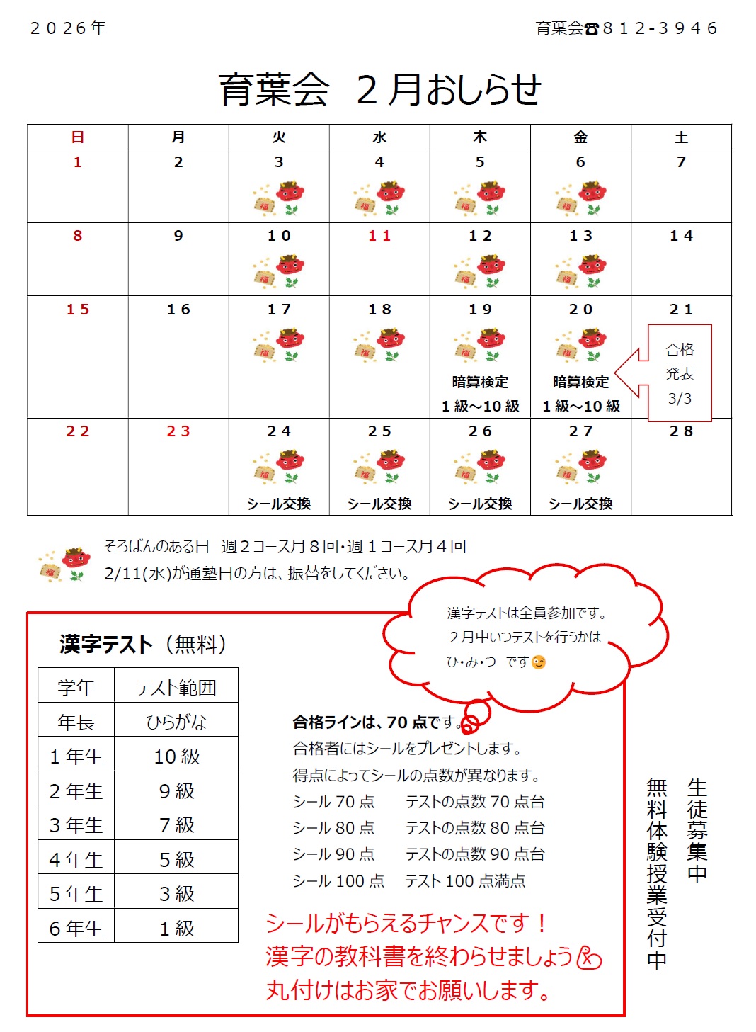 イベント 1月 お楽しみくじ(先生からのお年玉) 検定試験 珠算(15級~段位) 暗算(段位) 2月 検定試験 暗算(10級~1級) 漢字テスト 3月 春の新入生募集強化キャンペーン 検定試験 珠算(15級~段位) 暗算(段位) 4月 さんすう・さんすう応用強化月間 検定試験 暗算(10級~1級) 5月 検定試験 珠算(15級~段位) 暗算(段位) 6月 検定試験 暗算(10級~1級) 通信暗算競技大会 7月 検定試験 珠算(15級~段位) 暗算(段位) 8月 さんすう・さんすう応用強化月間 検定試験 暗算(10級~1級) ヨーヨー作り 9月 検定試験 珠算(15級~段位) 暗算(段位) 漢字テスト 全神奈川珠算選手権大会 10月 検定試験 暗算(10級~1級) さんすう・さんすう応用強化月間 ハロウィン 11月 検定試験 珠算(15級~段位) 暗算(段位) 12月 検定試験 暗算(10級~1級) 通信珠算競技大会 クリスマス会 毎月、お休みをしなっかった生徒には、シールをプレゼント!シールを集めて、色々な商品と交換ができます。 感染状況や、学校の状況に合わせて、変更する可能性があります。